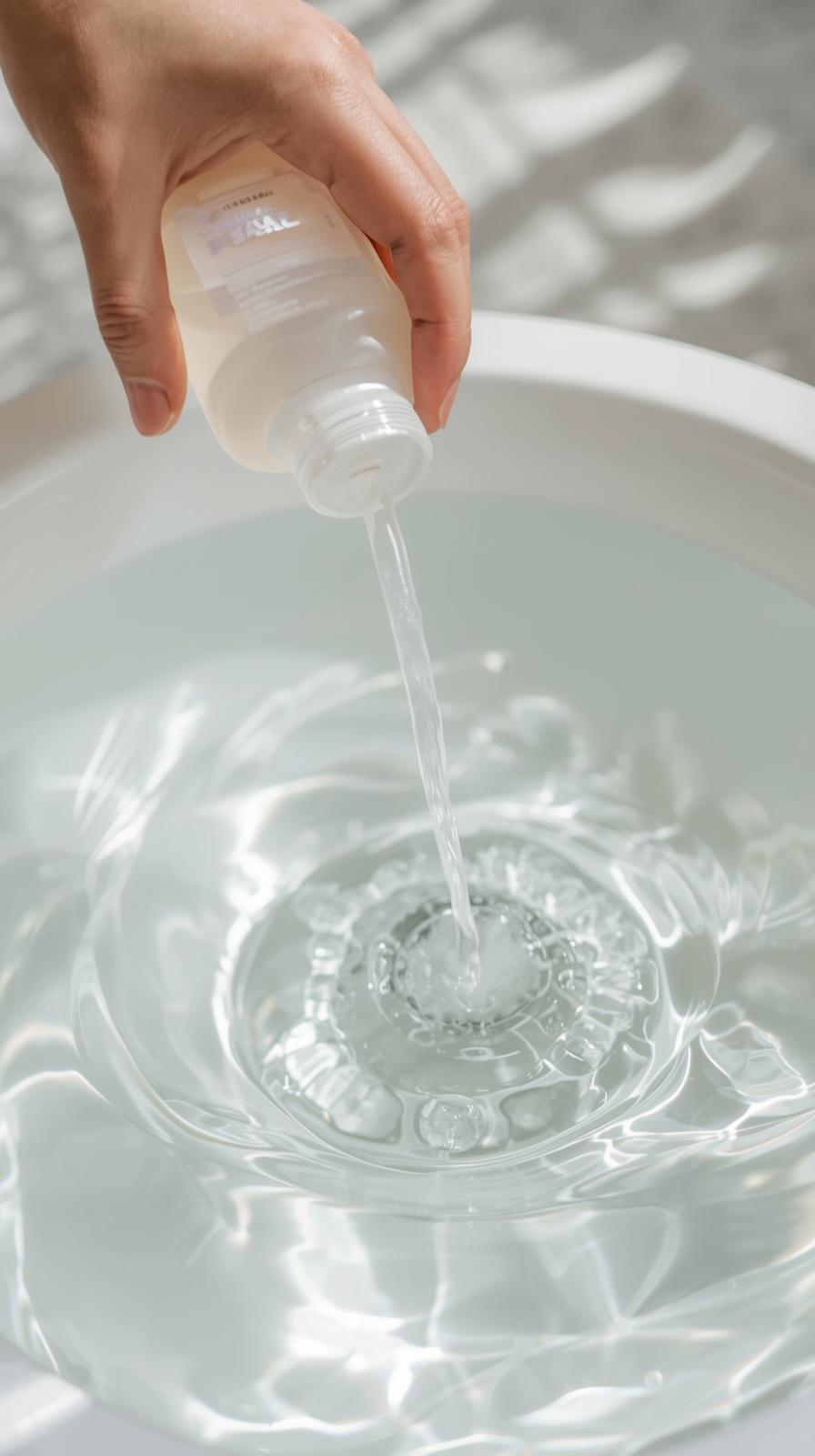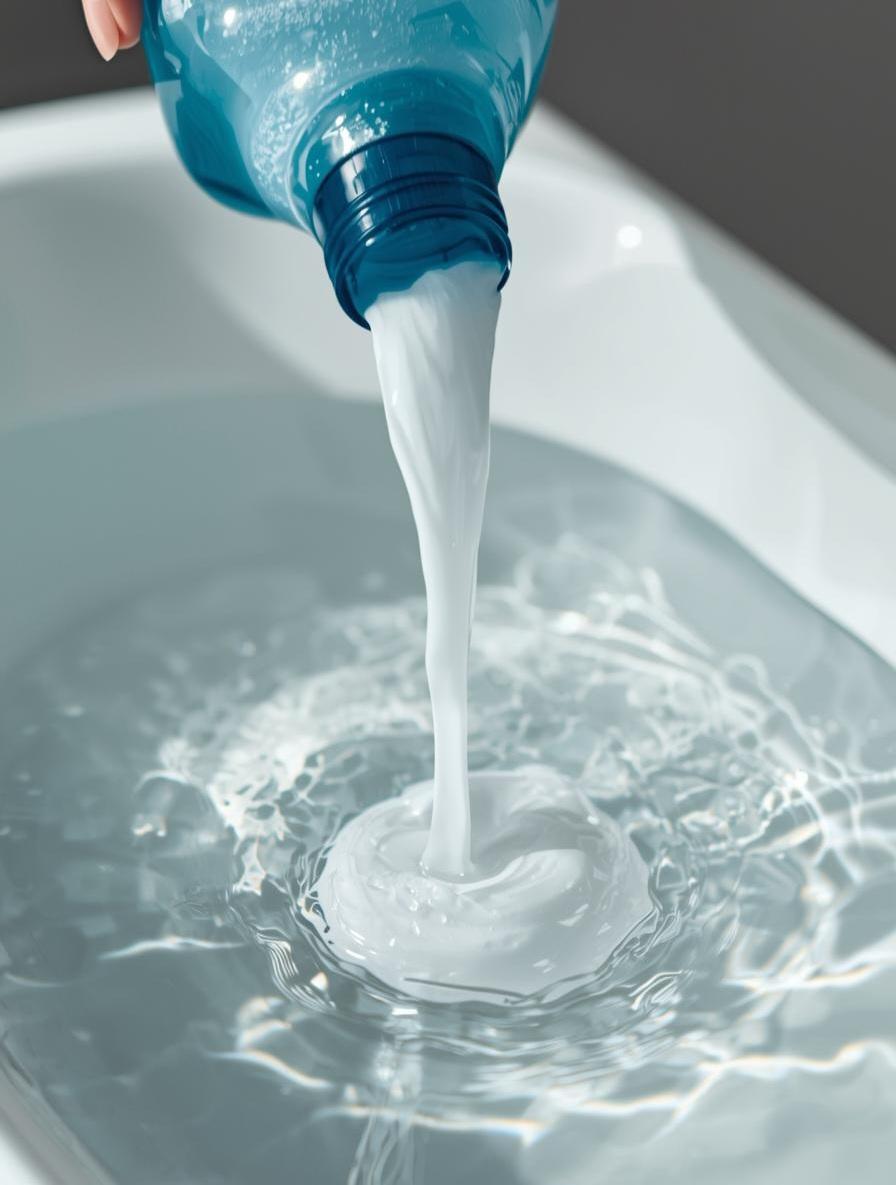 3. Dans une petite bassine remplie à mi- hauteur d’eau froide, j’ajoute 3 ou 4 noisettes de shampoing